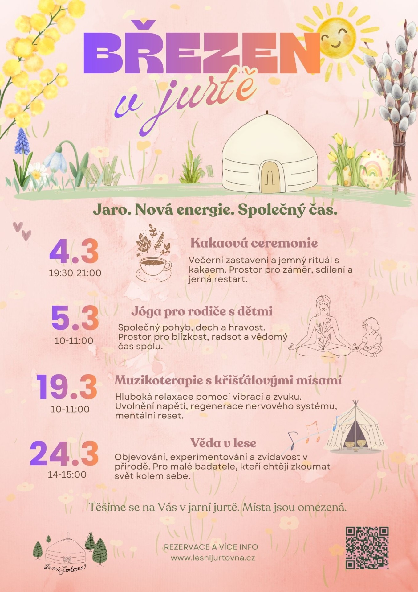 Jaro už je cítit ve vzduchu a s ním přichází nová energie i nové workshopy, které jsme pro vás připravili s láskou. Přijďte se s námi nadechnout jara, probudit radost, rozproudit energii a naladit se na nové začátky v přátelském kruhu jurty.